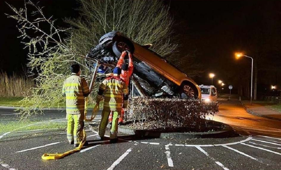 Numa cidade holandesa, o condutor de um Volkswagen Golf despistou-se numa rotunda e acabou por criar uma “obra de arte” ao deixar o carro numa posição insólita.