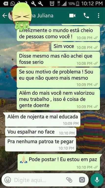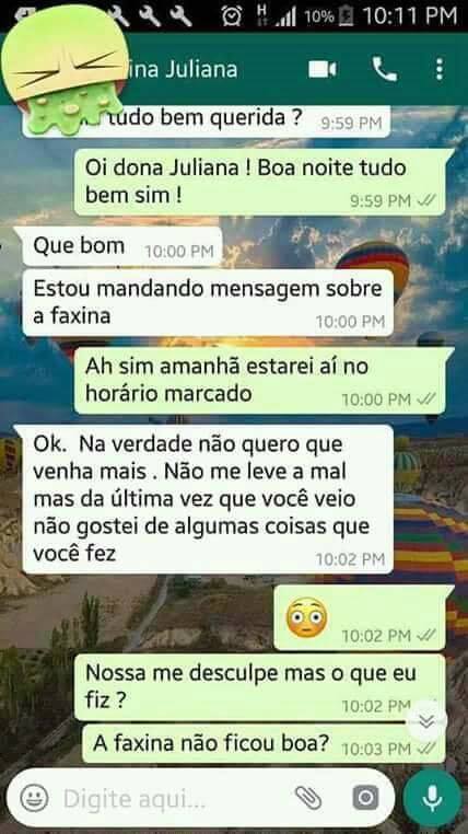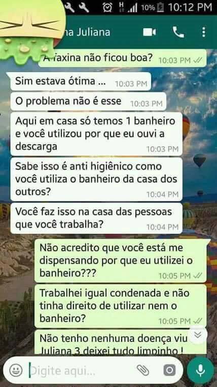 Identificada apenas como Dona Juliana, a mulher enviou mensagens pelo WhatsApp para a sua empregada doméstica dizendo que, apesar dos seus bons serviços, iria dispensá-la porque a ouviu a usar a casa de banho.
