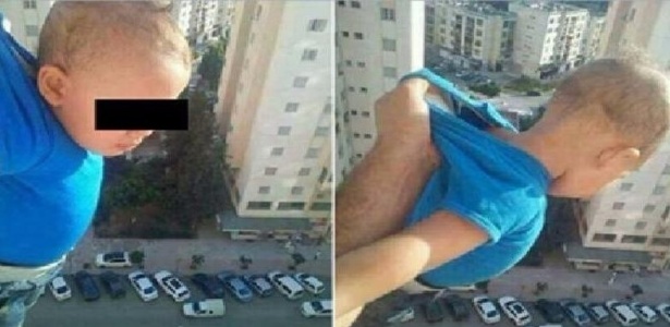 Na imagem, o pai segura o filho para fora da janela. Ele postou a imagem na rede social e, na legenda escreveu: “1 000 likes ou deixo-o cair”. A criança aparece com expressão de medo.
